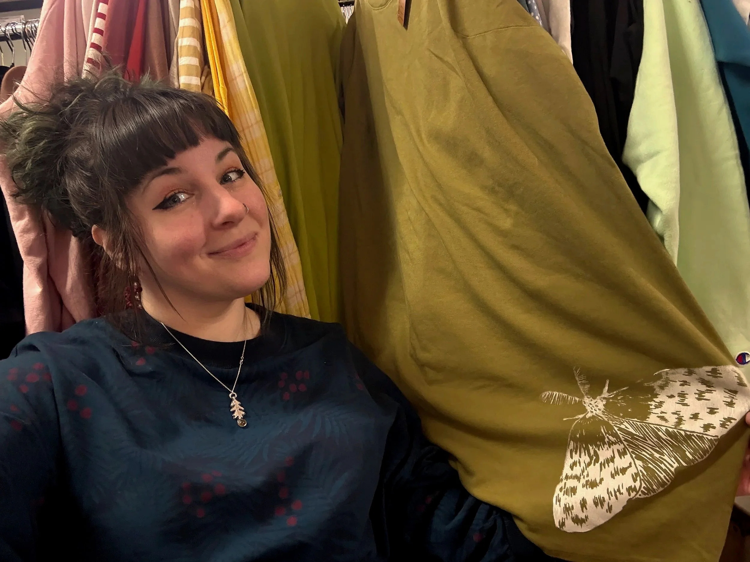 Some of those linocuts become screens that I print on lovingly washed secondhand clothing.